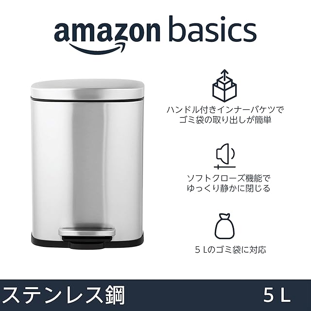 ベーシック ゴミ箱 5l(5リットル) ソフトクローズ 静音 ふた付き ペダル付き スチール製 ステンレススチール おしゃれ 長方形 シルバー
