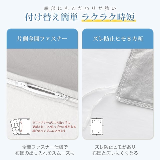 【商品情報】素材 -ポリエステル100%(ピーチスキン+洗いざらし) 仕様 -片側に全開ファスナー使用・布団留めひも8ヶ所付き 生産国 -中国