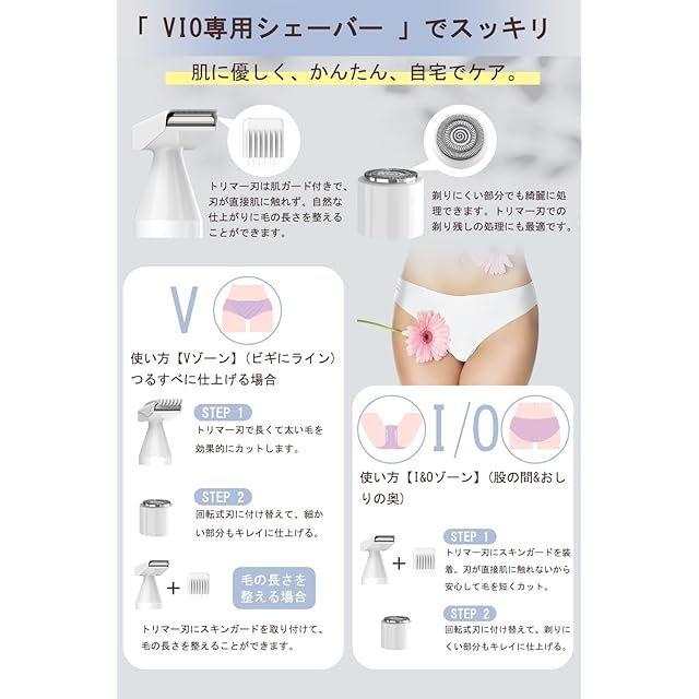 【VIO 専用シェーバー&眉毛鼻毛処理】デリケートゾーンの肌を傷つけにくい専用刃を使用、太い毛も入り込みやすい綱目構造ネット刃で。トリマ一刃にスキンガ一ドを装着。刃が直接肌に触れないから安心して毛を短くカット。ネット刃に付け替える。剃りにくい部分もつるすべに仕上げます。 VIO専用だから、肌にやさしく安心してケア。鼻毛カッタ一で清潔感UP、先端が丸みを帯びた超薄ので、高速回転モ一タ一を搭載し、太くて硬い鼻や耳の毛を素早くカットします。鼻腔を傷つけない、毛を引っ張られる心配がない。眉毛シェーバー 剃り味が抜群,理想的な眉毛に近づけることができます。