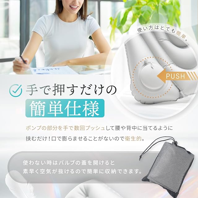 ✅【【選ばれる理由】口を付けずに膨らむから衛生的。口紅を塗られる女性の方に特におすすめです!エアー式で軽量コンパクトに収納できます。旅行バッグやビジネスバッグの中に入れても邪魔になりません。人間工学に基づいた腰をしっかり包み込んでくれる形状が特徴です。
