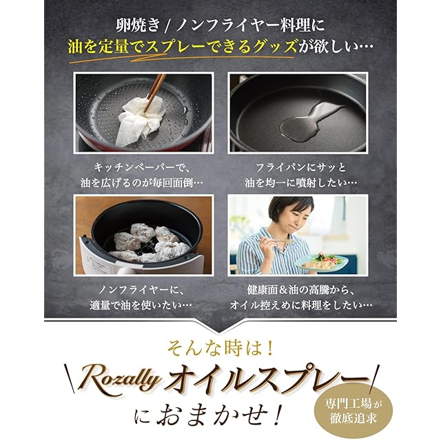 【こだわり】 様々なメーカーから キッチン 用品として ”ノンフライヤーオイルスプレー ”や” オイルスプレーボトル ”など ボトル型のオイル用品 が日本製/中国製など様々に販売されていますが、 Rozallyの オイルスプレー は”こだわり”が一味違います。 「液だれ防止の設計」で汚さずに使え、 「1プッシュ大さじ0.1杯」と定量でオリーブオイルなど使うことができます。 製菓用や料理用に大活躍すると人気のアイテムです。