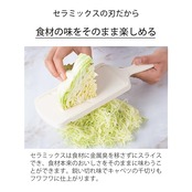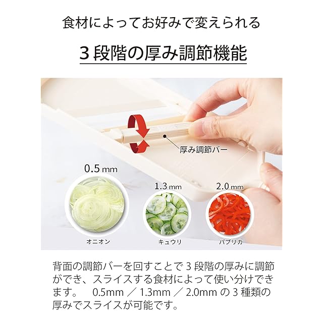 【厚み調節可能】ラバーグリップで握りやすい。セラミック刃だから「軽く、素早く、キレイに切れる」スライサー。3段階(0.5mm・1.3mm・2.0mm)の厚みに調節が可能。玉ねぎやきゅうり、パプリカ、キャベツなど食材によって使い分けられる。キャベツのせん切りも簡単
