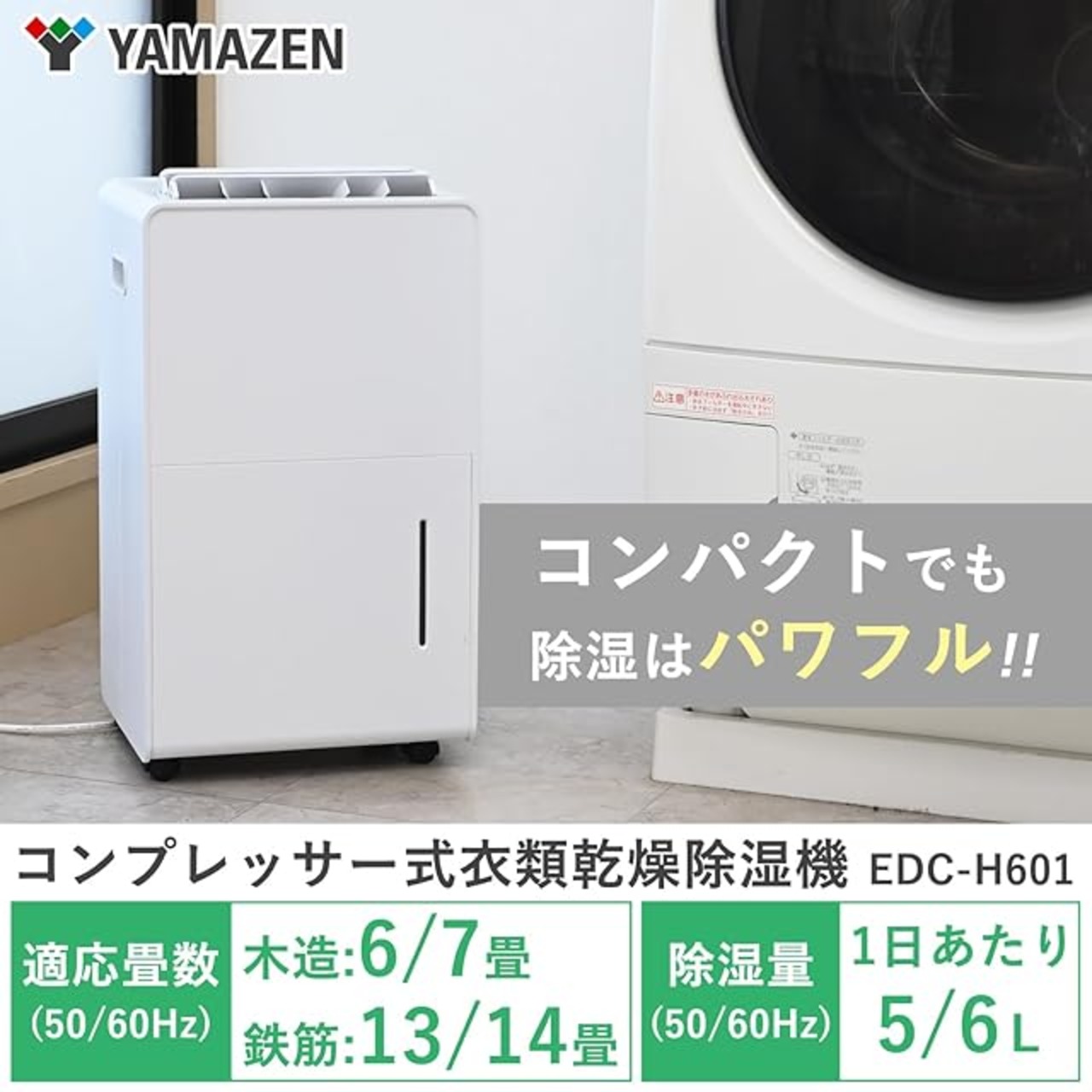 [山善] 除湿機 衣類乾燥 除湿器 コンプレッサー式 小型 強力除湿 除湿量 6.0L 衣類モード 切タイマー キャスター付き マットホワイト EDC-H601(W)