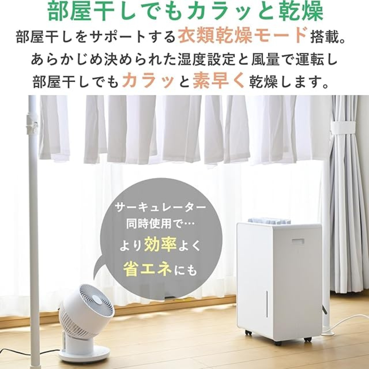 【衣類モード】部屋干しをサポートする衣類モード搭載。ワンタッチであらかじめ決められた湿度設定と風量で運転し、部屋干しでもカラッと素早く乾燥します。また、ルーバーが2箇所設置されているので、洗濯物に風があたりやすく衣類などを効率的に乾燥でき、送風方向も90度まで調節できるので、ピンポイントで洗濯物に風を当てることも可能です。
