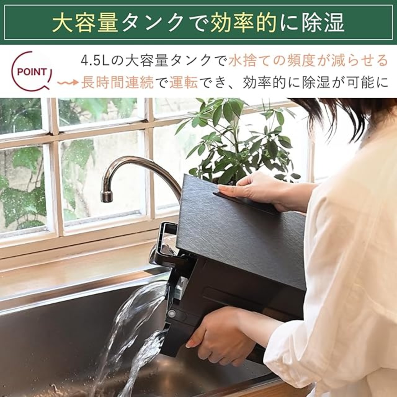 【除湿機能】▪除湿面積の目安:木造6畳/プレハブ10畳/鉄筋13畳(50Hz)、木造7畳/プレハブ11畳/鉄筋14畳(60Hz) ▪タンク容量:約4.5L ▪除湿方法:コンプレッサー式 ▪定格除湿能力:5.0L/日(50Hz)、6.0L/日(60Hz)