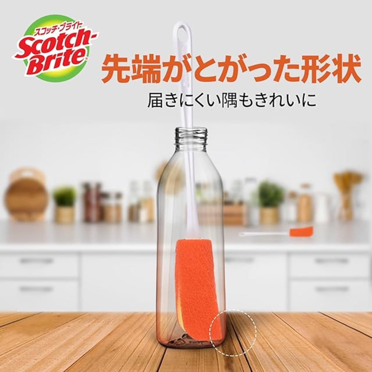 【ボトルの底までしっかり届く!】ボトルの底のスミにフィットする、先端がとがった三日月形状のスポンジ。長くて丈夫なハンドルで、洗いにくいボトルの底をしっかり洗えます。