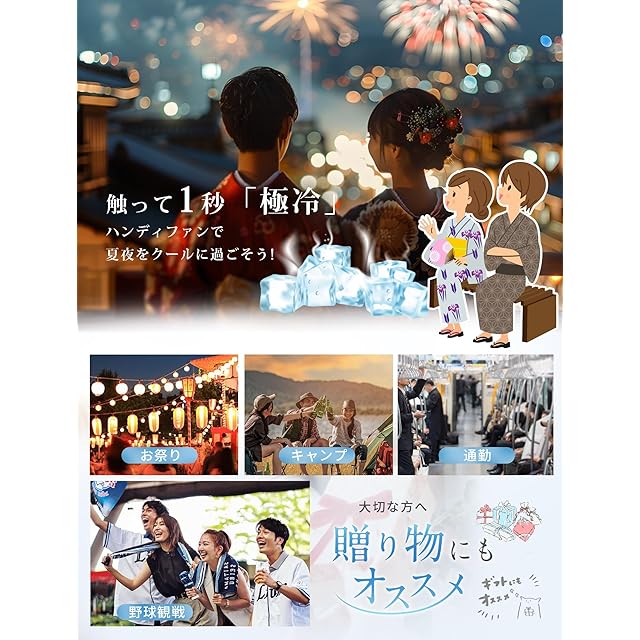 「いつでも、どこでも」使えるコンパクト設計!あらゆる夏のシーンをクールにサポート!毎日の生活シーン(ギュウギュウの通勤電車,オフィスのデスク周り,車内のスポット冷却)レジャーやイベントでも(花火大会の混雑した会場,夏祭りの人ごみの中,スタジアムでの熱い応援),アウトドアアクティビティに(キャンプサイトの暑さ対策,バーベキューの炎のそばで,釣りやハイキングの休憩時)図書館やオフィスでも気兼ねなく使用可能;充電ストレスフリー1回のフル充電で朝から夕方までフル活躍!ノートPC/モバイルバッテリー/車載充電器と全デバイス接続可能!どこでもサッと充電OK