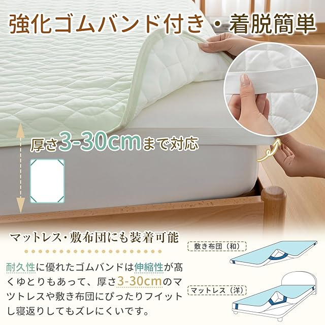 【着脱簡単・ズレにくい】敷き布団でもマットレスでも使える四隅にゴムパンド付きで、寝返りでもズレにくくお洗濯の際の着脱も簡単です。マットレスの厚さは20cmまで対応、200cm丈の敷き布団でもお使いいただけます。