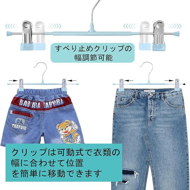 【移動可能】クリップ部分の間隔が左右に23cmから28cmまで移動可能のスカートハンガーです。衣類のサイズに合わせて位置を調整できるので、子供から大人まで様々な衣類を掛けられます。