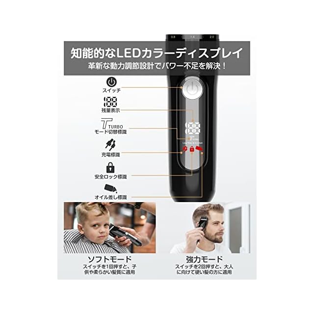 【知能的なLEDディスプレイ&変速調節】電動バリカンはLEDカラーディスプレイが搭載され、電源残量、スピードレベル、オイル残量と安全ロックなどの情報も直接に表示され、一目瞭然で快適に使用可能です。大人だけではなく、子供または幼児もこのバリカンが家族全員で楽しくヘアカット。2段階速さを調整可能で、革新的な動力調節設計でパワー不足を解決し、初心者も手軽にプロ散髪を仕上げり、家庭用・業務用・出張用などの場合に大活躍です。