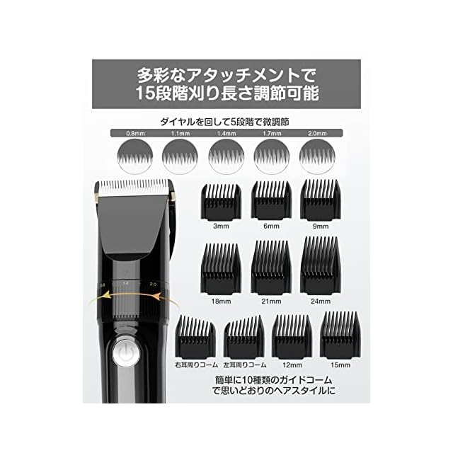 【5段階刈り高さ&10種類ガイドコーム】ダイヤルと合わせて0.8mm-2.0mmまで0.3mmずつ5段階の刈り高さを自由に調節できる電動バリカンです。それに、3mm、6mm、9mm、12mm、15mm、18mm、21mm、24mm、左&右もみあげ櫛のような10種類ガイドコームを付属して必要に応じて選べて、お好みにより髪の長さに簡単キレイにカットできます。髪の毛を少し整え、坊主まで、床屋に行かず自宅で簡単に多彩なアタッチメントで思いどおりのヘアスタイルも色々と楽しめます。
