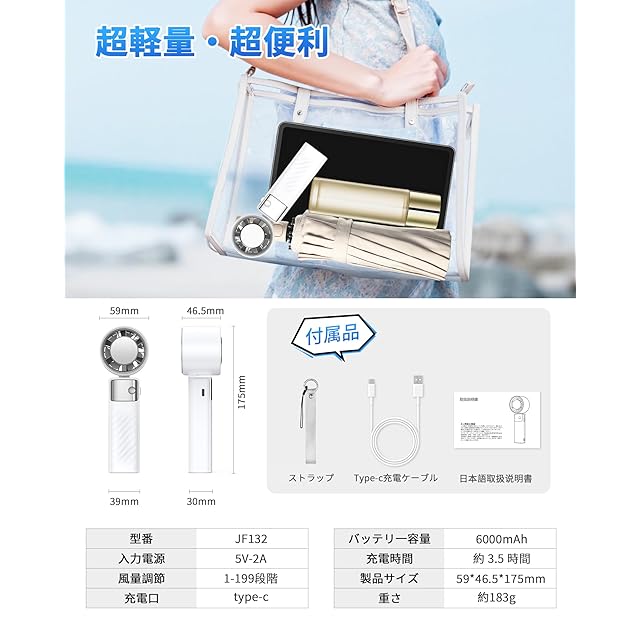 ❄【超軽量&コンパクトで持ち運び便利】 わずか190gの超軽量設計で、折りたたみ可能な小型サイズ。付属のストラップを活用すれば、バッグから下げて持ち運ぶこともできます。ポータブルファンとして、ハンドバッグやカバンに収納可能です。