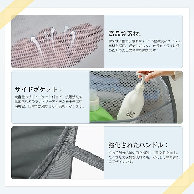 【優れた通気性】メッシュ生地で作られた洗濯かごは、軽量かつ通気性に優れています。通気性の良さにより、かご内にこもる湿気を防ぎ、衣類にカビが生えにくく清潔に保てます。
