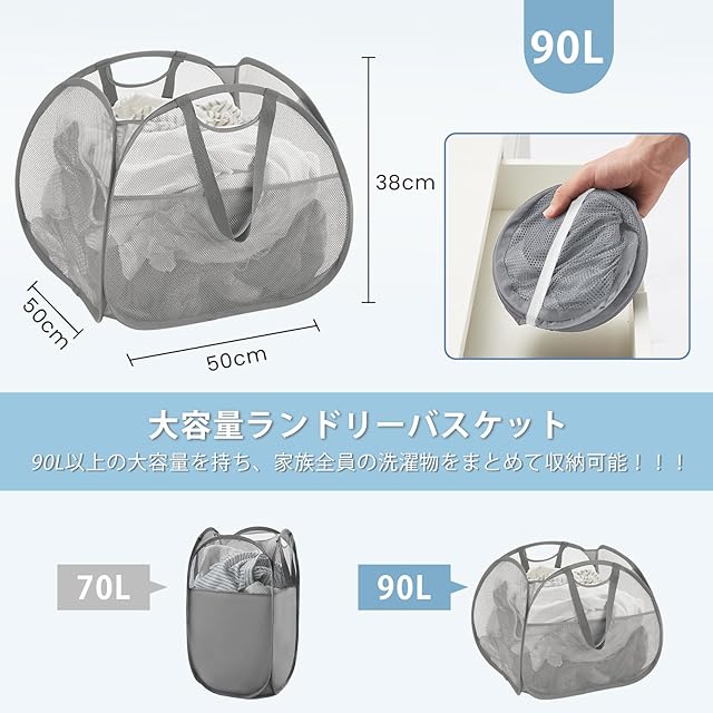 【大容量】90L以上の大容量で、サイズは長さ50cm×幅50cm×高さ38cmと、1週間分の洗濯物を十分に収納できます。また、便利なサイドポケットもあり、洗剤やタオル、靴下などのアイテムをすっきりと整理できます