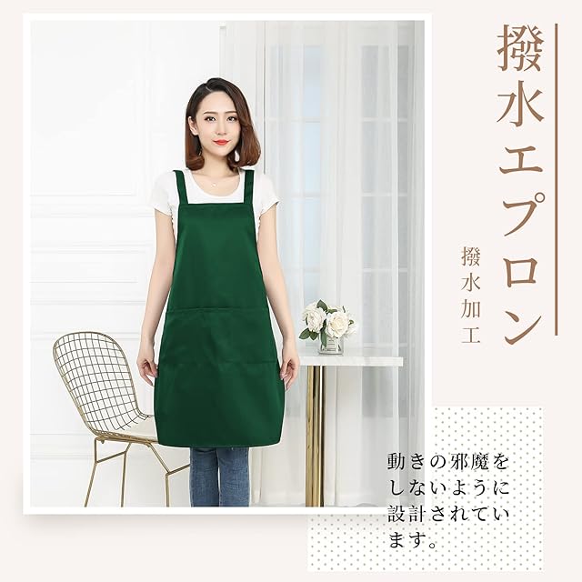 [cozycube] エプロン H型 首掛け シンプル 女性用 男性用 メンズ レデイース カフェエプロン 無地 おしゃれ 大容量ポケット 汚れにくい シワ防止 男女兼用 ノーアイロン 透けない ポケット付き 料理教室用 (グリーン(撥水加工))