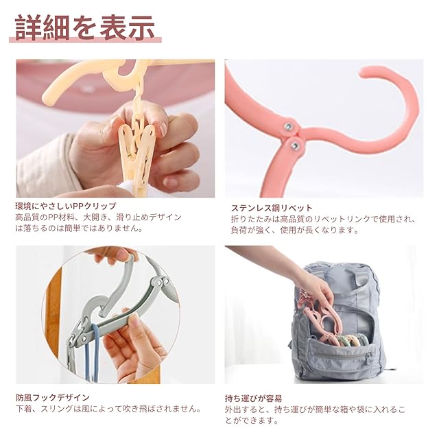 【多くの場面で使用】洗濯の後、ただ服の物干しハンガーではありません、ピンチ付きなので、靴下、下着、タオル、帽子、ジーンズ、Tシャツ、パンティー などにも適用します。海外旅行や国内旅行、出張やアウトドア、家庭用などで大活躍する機能的な折りたたみハンガーです。プレゼントとしても適切です。