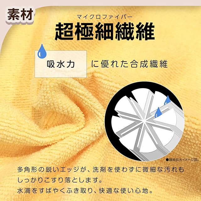 超極細繊維が油汚れやほこりなどをスッキリ落とし、水滴をすばやく拭き取ります。