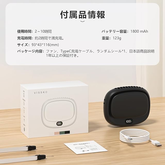 【幅広い使用・12ヶ月間安心】パッケージ:扇風機本体*1 、首掛け用ロープ*1、USB-A to Type-C充電ケーブル*1、ランダムシール*1、取扱説明書*1;さらに、ご購入日から1年間の品質付きです。私たちはお客様をサポートするために全力を尽くします。
