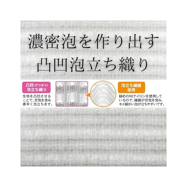 細めの66ナイロンを使用しているので、キメ細かい泡が立ちやすい ボディタオルです