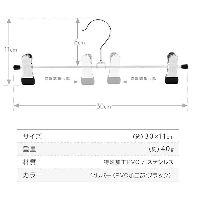 【可動式クリップで位置調整可能!】クリップは可動式で衣類の幅に合わせて位置を簡単に移動できます。大人用衣類から子供用まで幅広い衣類に対応し、様々な用途に適したハンガーです。
