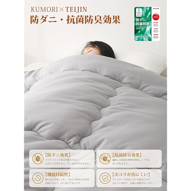 クモリ(Kumori) 掛け布団 セミダブル オールシーズン 軽量 洗える 「TEIJIN 抗菌消臭中棉」 秋冬 2.6kg 暖かい ふんわり 柔らかい ほこりが出にくい 保温 通気 掛けふとん 年中使える グレー 170X210cm
