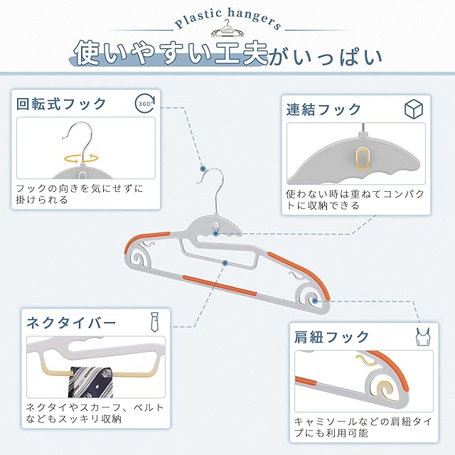 【.co.jp 限定】チチロバ(TITIROBA) ハンガー すべらない 襟が伸びない かたくずれ防止 連結フック付き 多機能 おしゃれ 30本組 オレンジ