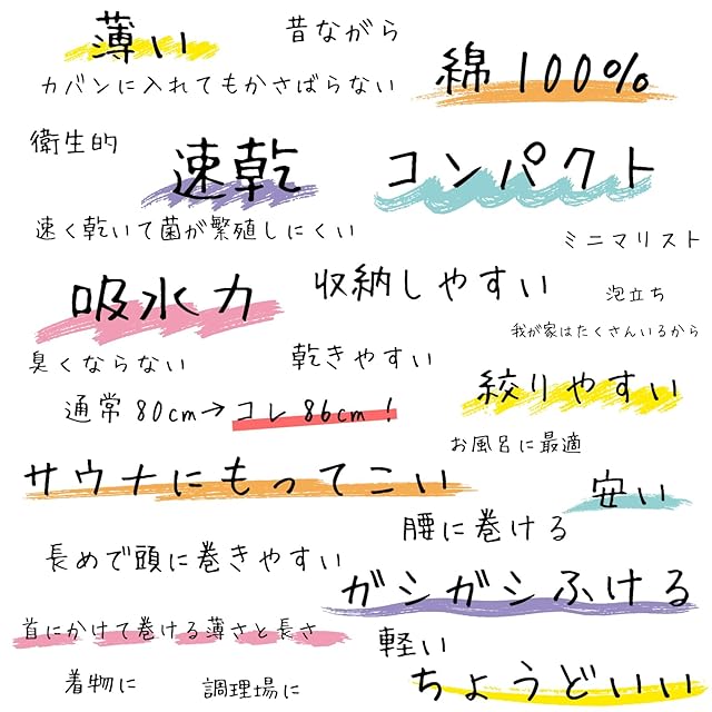 【長めの86cmロングタイプ】一般的なフェイスタオルの長さ80cmよりも長めの86cm、頭に巻きやすく薄手タイプなので収納もコンパクト