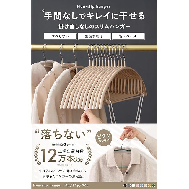✅【滑り止め加工で衣類をしっかり固定】PVC加工により、シルクやリネンといった滑りやすい素材の衣類もしっかり固定可能。すべらないハンガー(スーツハンガー)として、洋服の落下によるストレスを軽減します。薄手の衣類から厚手のアウターまでオールシーズンご使用いただけるかたくずれ防止タイプの滑らないハンガー セットです。