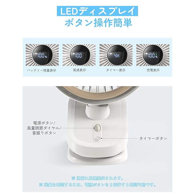 「タイマー機能・電池残量ランプ」このクリップ扇風機は便利な2時間/4時間/6時間の三段階タイマー機能を搭載しており、就寝時や外出前に好みの作動時間を簡単に設定可能です。扇風機はタイマー設定後が自動で運転を停止するので、電気の無駄遣いを防ぎながら安心して使用できます。USB充電式でどこでも使える手軽さと、スマートな機能性を兼ね備えた実用的な扇風機です。