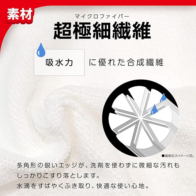 超極細繊維が油汚れやほこりなどをスッキリ落とし、水滴をすばやく拭き取ります。