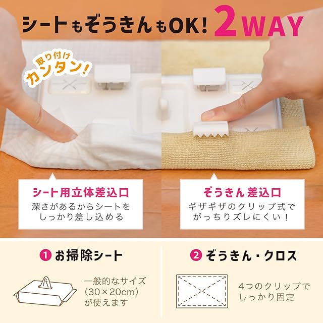 がっちりはさめるクリップ式なので、ぞうきんやクロスでもゴシゴシ拭ける!