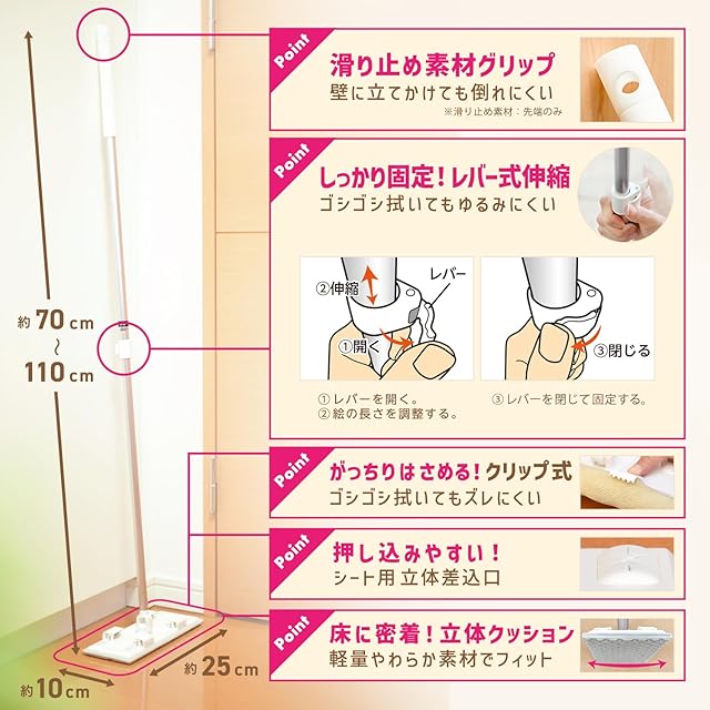 商品名:レック 激落ちくん クリップ式 ワイパー (伸縮)/ぞうきん・クロスもOK/ガッチリはさめる/床に密着 立体クッション