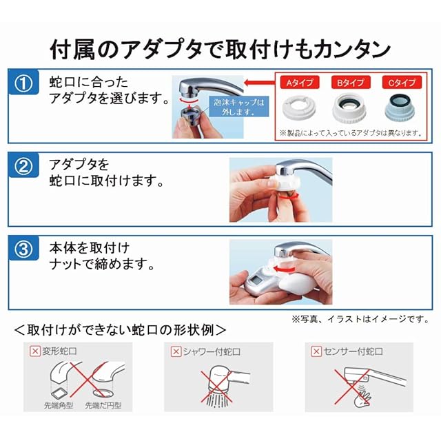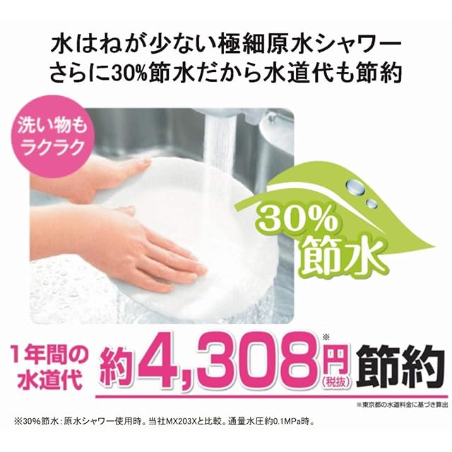 30%節水機能搭載※1、水はねの少ない極細シャワー、高除去タイプ、1L約5円※2、日本製、洗える吐水カバー、コンパクトサイズ、簡単取り付け、※については商品の説明(ページ下部)に記載