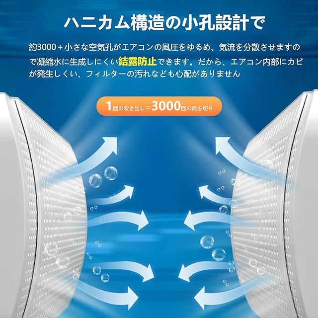 結露防止:約3000+小さな空気孔がエアコンの風圧をゆるめ、気流を分散させますので凝縮水に生成しにくい結露防止できます。だから、エアコン内部にカビが発生しくい、フィルターの汚れなども心配がありません