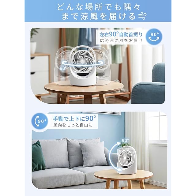 【左右自動首振り・上下角度手動調整】当社のサーキュレーターは左右90°の自動首振り機能を搭載しており、頻繁に手動で位置を調整する手間が省けます。また、上下90°の手動調節が可能で、座っている姿勢や寝転んでいる姿勢に合わせて、風を快適な位置に送ることができます。