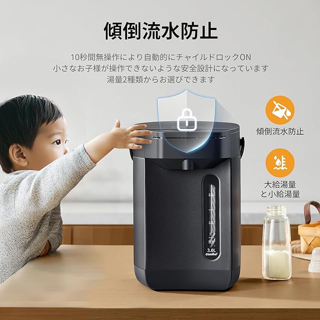 COMFEE' 電気ポット 電動お湯ポット 3L マイコン 保温温度調整 安全ロック 湯量選択 機能 省エネ インディゴグレー