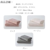 【厚手生地で吸水性に優れる】キッチンタオルは吸水性に優れたマイクロファイバーを採用し、食器の水分がサッと吸い込まれて使いやすさにこだわりました。また、速乾性も良く洗濯後に素早く乾きます。セット内容:グレー×3枚、ベージュ2×枚、ピンク1枚。サイズ:約30×30cm 重さ:約30g(1枚あたり) 材質:ポリエステル、ナイロン カラー:3色展開(グレー、ベージュ、ピンク)