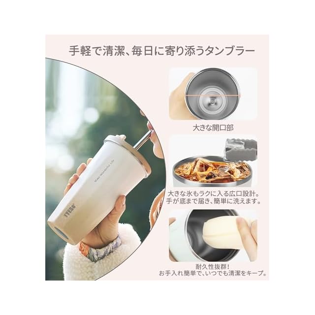 広口デザインで洗浄簡単:広口設計により、このタンブラーは底まで手が届きやすく、内部を簡単に隅々まで洗浄できます。コーヒーやお茶の汚れ、臭いが残らず、いつでも清潔に使用できるタンブラーです。清掃が簡単で、使用後の手間も少なく、毎回新鮮な飲み物を楽しめます。