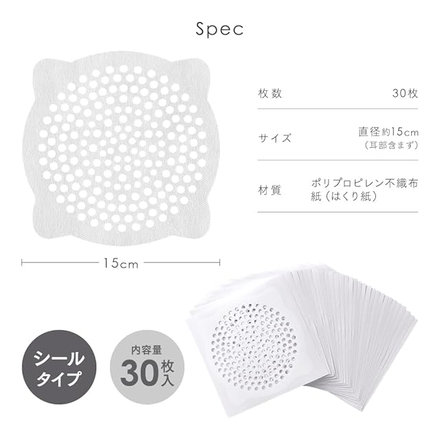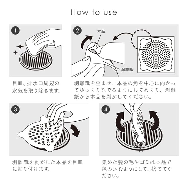 【使用方法】①目皿、排水口周辺の水気をタオルなどで完全に取り除いてください。②剥離紙を歪ませ、本品の角を中心に向かってゆっくりなでるようにしてめくり、剥離紙から本品を剥がしてください。③剥離紙を剥がした本品を目皿に貼り付けます。④集めた髪の毛やゴミは本品で包み込むようにして、捨ててください。