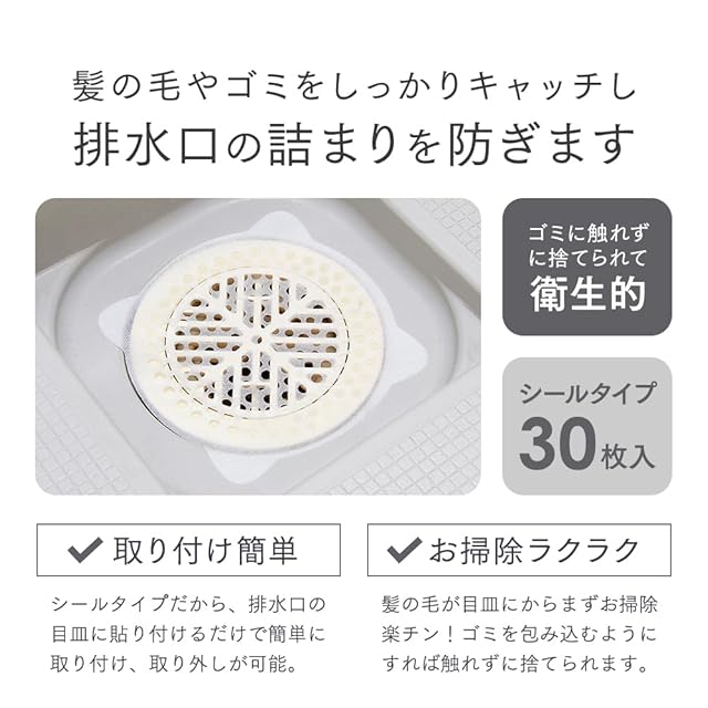 【取付簡単】シールタイプだから、排水口の目皿に貼り付けるだけで簡単に取り付け、取り外しが可能。詰まりにくいから嫌なニオイを防ぎ清潔