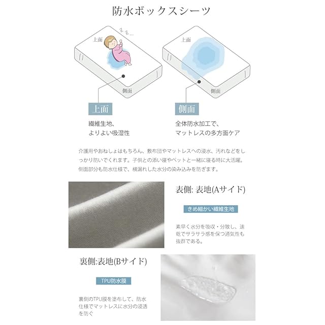 【五面完全防水設計!側面もしっかり防水】お客様から「側面が防水加工されていない」という貴重なご意見をいただき、Vallein完全防水シーツを開発しました。従来品より五面防水に進化し、介護用やおねしょはもちろん、敷布団やマットレスの浸水や汚れなどをしっかり防ぎます。裏地は防水・通気性優れたTPU素材を使用しており、マットレスや敷布団を水分や汚れから守ります。不快感を軽減し、快適にお過ごしいただけます。
