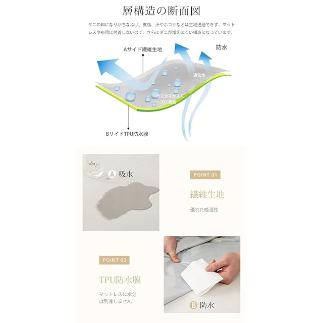 【吸水速乾・防ダニ・抗菌】Vallein完全防水シーツは、洗濯機で丸洗いした後、従来品よりも短時間で乾きます。ダニの栄養分であるケア、アカ、湿気などをマットレスに溜め込まないため、ダニの繁殖を抑制します。一年中快適にお使いいただけます。