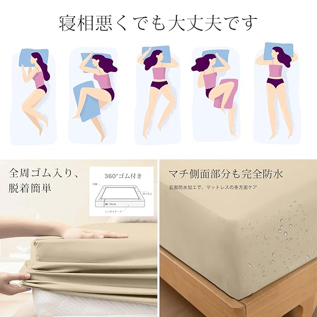 【ピーチスキン加工・サラサラ音軽減】Vallein完全防水シーツはピーチスキン加工を施した、モモのようなサラサラした肌触りで、毛玉やシワになりにくく、ガサガサ音を極限まで軽減します。また、全周360°のズレ防止ゴムが付いているので、着脱が簡単で、寝相が悪くても大丈夫です。