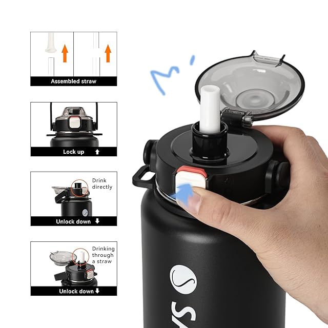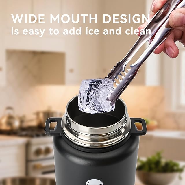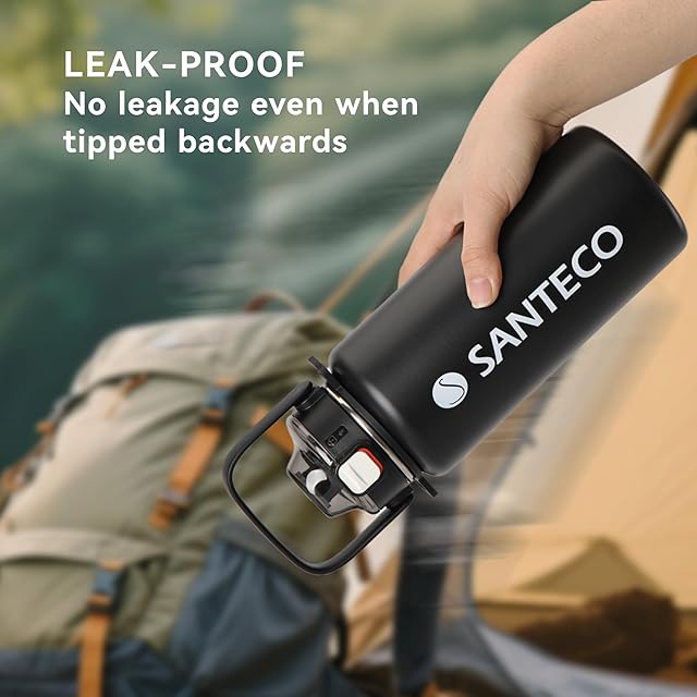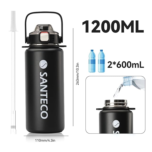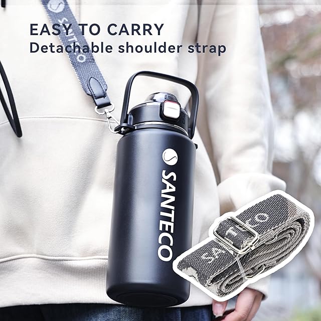 SANTECO 水筒 真空断熱スポーツボトル 1.2L 取りはずしでき肩に 保冷 保温 魔法瓶 ストロー付き 直飲み スポーツドリンク対応 おしゃれ 広口 ブラック