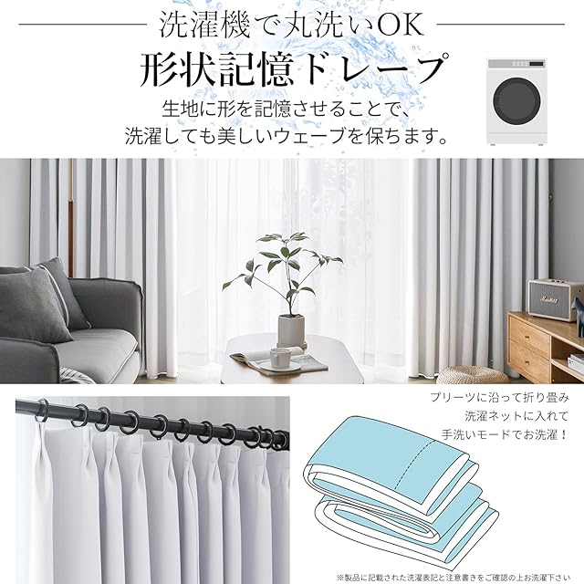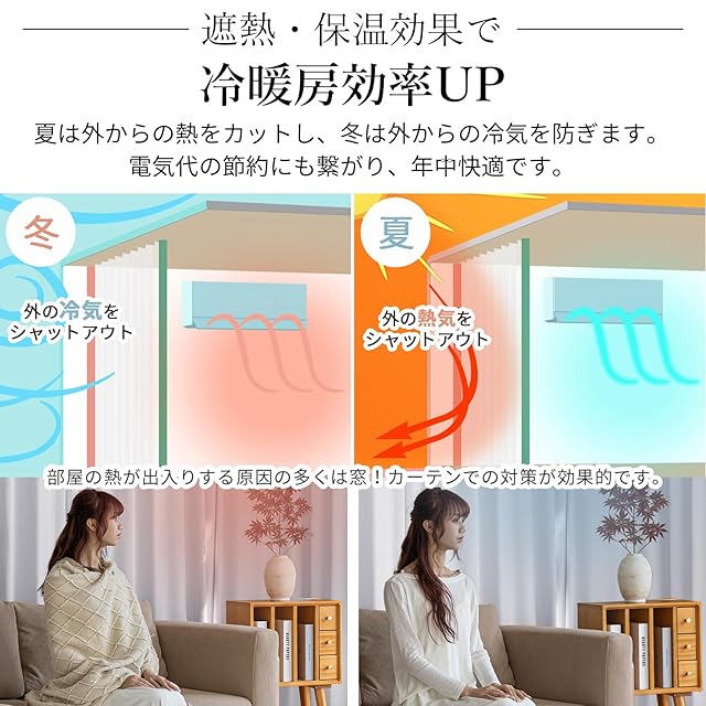 【遮熱保温·形状記憶】届いてすぐ使えるドレープカーテン2枚、同色タッセル付きます。夏は外の熱気をカットし、室温の上昇を抑え冷房効率アップします。冬は外の冷気を遮り、室内の暖かい空気を逃がさないので暖房効率もアップします。ペットにも95年中快適に過ごせます。洗濯機でまるごと洗えます。お手入れしやすいのでいつも清潔に使用できます。カーテンの重みで洗濯ジワも伸ばすことができので、形態安定としてはとても効果が期待できます。