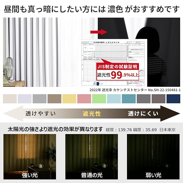 【1級遮光】迷ったらこれ!シンプル&機能性重視の方におすすめです。この2枚セット(1級遮光ドレープカーテン2枚)を選択する理由:①光沢を抑えたマットな質感が美しい。②黒ずみの少ないなめらかな生地。③快適に過ごせる優れた性能。遮光率99.9%以上、日差しの強い窓でもしっかりと遮光できるので、光をできる限りシャットアウトしたい方におすすめです。