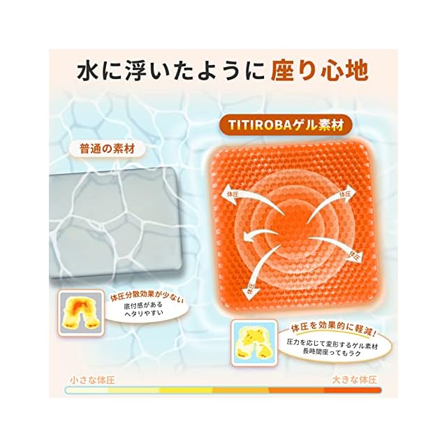 【ジェル素材・衝撃吸収】クッション性に富んだゲル素材を使用。ジェルクッション特有のクッション性で座るとき体の重さと座面からの圧迫を吸収。おしりにやさしい。