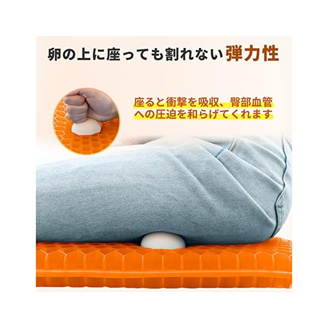 【体圧分散、長時間座っても楽】人間工学に基づくデザイン。ゲル素材とハニカム構造で体圧が分散されるので、座り方によっては生卵置いて上から座っても割れないこともある。適度な硬さで体圧を均一に吸収・分散。