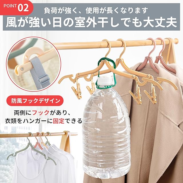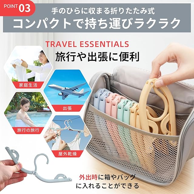 【多くの場面で使用】洗濯の後、ただ服の物干しハンガーではありません、ピンチ付きなので、靴下、下着、タオル、帽子、ジーンズ、Tシャツ、パンティー などにも適用します。海外旅行や国内旅行、出張やアウトドア、家庭用などで大活躍する機能的な折りたたみハンガーです。プレゼントとしても適切です。