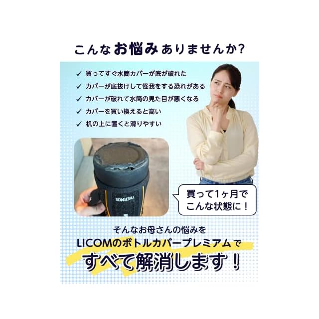 【買い替えより安い】純正の水筒カバー、水筒ポーチを買い直すと2000円くらいして、本体ごと買い替えた方がいいんじゃないか。。と思ったりしたことはありませんか?LICOMのPremiumBottleCoverなら2つで1000円ちょっとなので半額以下でお財布に優しい料金形態になっています。特にTHERMOS(サーモス)、象印の水筒カバーは高いので、本商品で安く長く使っていただけると大変嬉しいです。